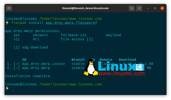 linuxmi@linuxmi /home/linuxmi/www.linuxmi.com ⚡ flatpak run app.drey.Warp