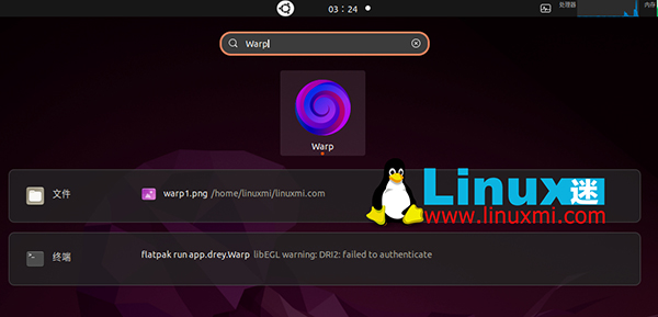 安装后,按键盘上的Super/Windows键并搜索并打开应用程序,或运行命令flatpak run app.drey.Warp从终端启动它。