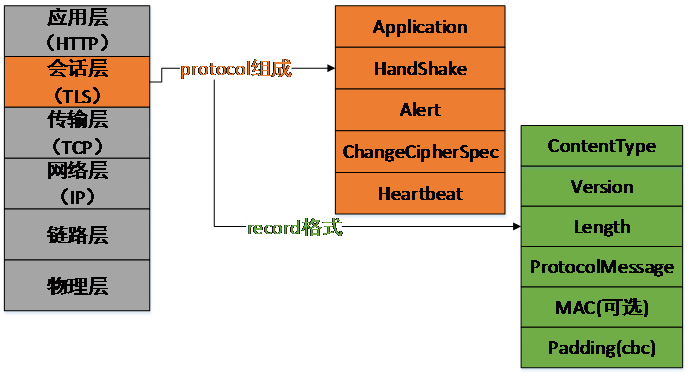 TLS 协议本身又是由 record 协议传输的,record 协议的格式如上图最右所示。