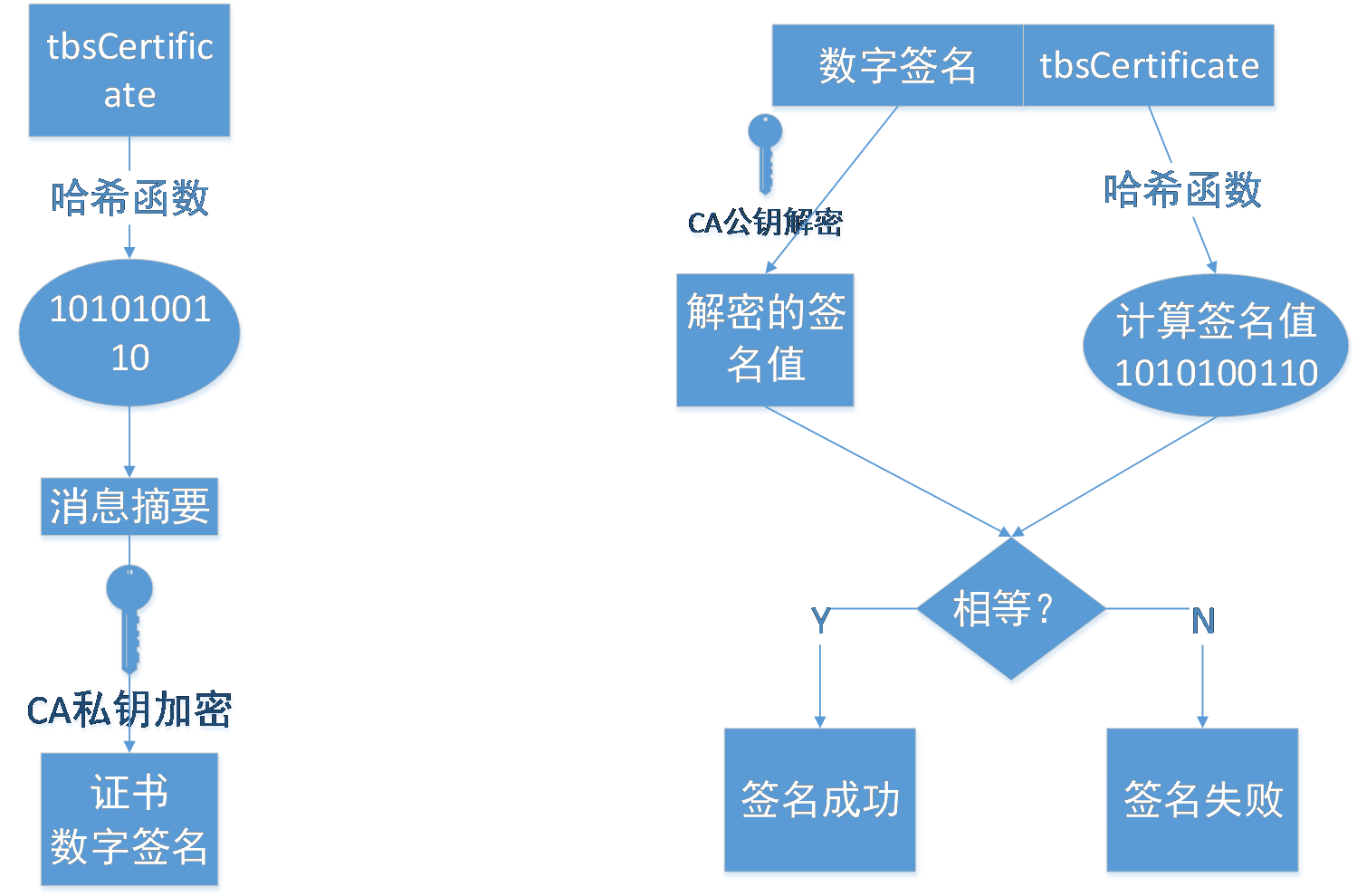 答案就是数字签名(digital signature)。数字签名是证书的防伪标签,目前使用最广泛的 SHA-RSA 数字签名的制作和验证过程如下: