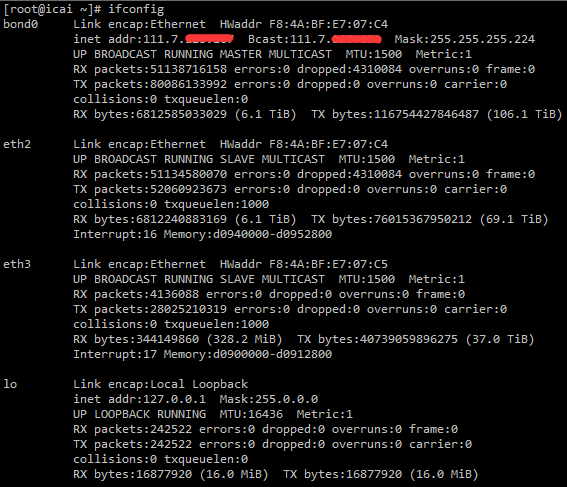 $vi /etc/sysconfig/network-scripts/ifcfg-bond0 DEVICE=bond0 BOOTPROTO=static ONBOOT=yes IPADDR=100.100.100.100 NETMASK=255.255.255.0 GATEWAY=100.100.100.1 TYPE=Ethernet