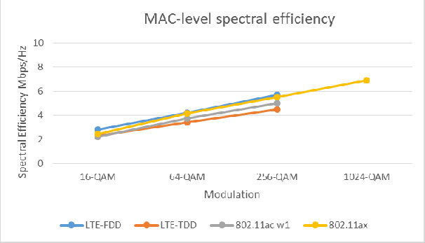 两种方案都能让信道得到充分的利用。参考Aruba Networks发布的测试结果可以看出,LTE和Wi-Fi 6在MAC层面的频谱使用效率非常接近,单流、256QAM的情况下,都能到5Mbps/Hz以上的频谱使用效率。