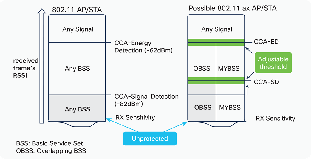 进入仲裁过程的Wi-Fi设备,首先开启信道侦听模式,RF接收机对无线信道中的802.11信号进行监测(Signal Detection)。如果侦听到的信号强度低于其SD阈值(以下图思科的方案为例,阈值为-82dBm)时,设备判定目前信道没有其他Wi-Fi设备在使用。