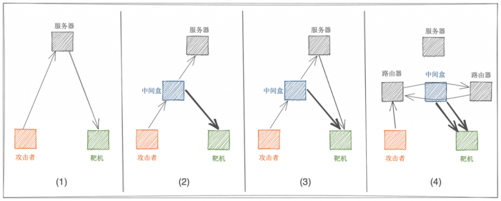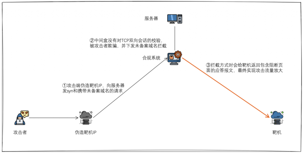 之所以说中间盒没有或者说无法严格遵循 TCP 协议栈是因为:现网很多中间盒例如防火墙、合规系统等考虑到网络架构、性能、稳定性等因素都会采用旁路部署、单边流量检测的架构,即这些系统本身只能看到机房入向的流量数据,最终这些中间盒只能根据单向流量判断是否存在 TCP 连接,甚至有中间盒不判断是否存在 TCP 连接,直接解析请求内容并下发拦截策略。所以攻击者发起这种新型 TCP 反射攻击的流程简单总结起来只需要以下几步: