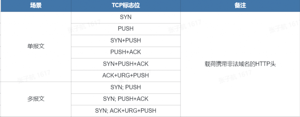 由于这种新型 TCP 反射攻击本质上是利用了部分中间盒的弱点,而全球互联中存在种类极其繁多的中间盒,不同类型的中间盒具体机制存在差异,所以需要找到有效、高效、通用的方法,欺骗中间盒,使其误以为 TCP 连接已经建立。通过测试和分析,最终发现主要有以下 TCP 报文类型或组合可以欺骗中间盒: