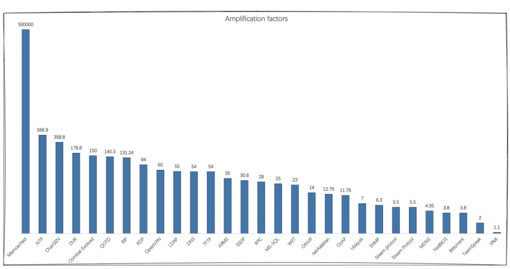 放大系数可以理解为流量的放大倍数,计算方法非常简单,就是 response 总长度/query 总长度。传统的 UDP 反射攻击的放大系数与具体的协议实现相关,所以放大系数是一个相对固定的值:除了 Memcached 反射攻击以外,其他 UDP 反射放大系数不超过 600,而且以 200 以内为主。