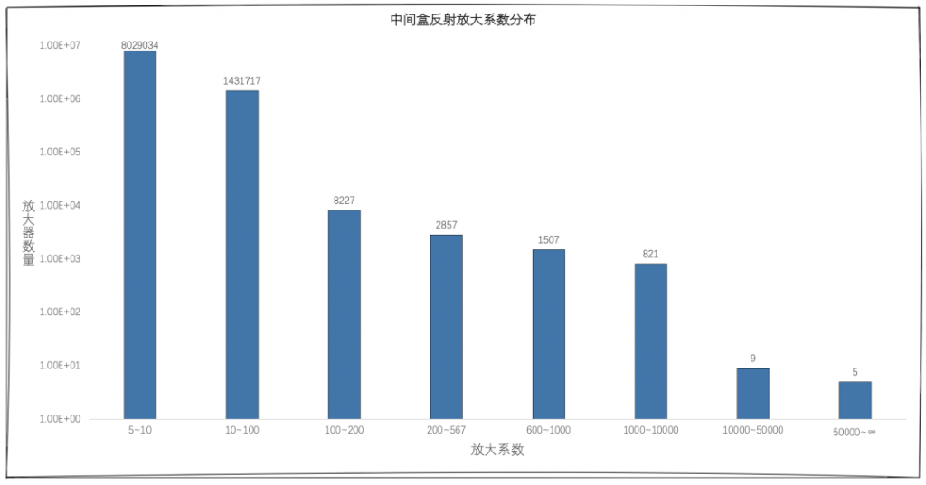 而当前这种新型 TCP 反射攻击的放大倍数却并不是一个固定的值,因为不同地区、不同厂商、不同类型的中间盒的拦截方式并不一致,甚至可以说是差别巨大。所以为了量化和评估这种手法的放大系数情况,我们对全网网段进行扫描,并对放大系数超过 5 的反射放大器进行统计分析:大部分反射放大器的放大系数在 5~100 之间,同时发现超过 1 万个放大系数在 100~10000 的强力放大器,不过更让人吃惊的是还发现了几个放大系数超过 1 万,甚至超过 5 万超级放大器。