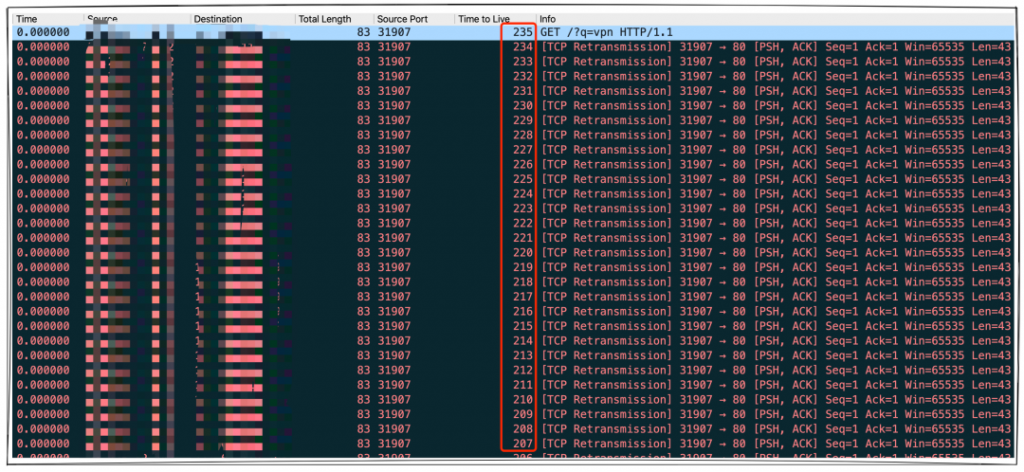 这个场景最为特殊,攻击请求到达服务器所在 IDC 机房后,由于路由环路使请求在两个路由器之间循环,最终导致中间盒收到大量请求,最终给靶机多次应答阻断页面。我们知道数据报文中有 TTL 字段,每经过一个路由设备就会减一,直到减到 0 报文才会被丢弃。而攻击请求报文的初始 TTL 设置为 255,这就意味着经过路由环路,放大系数会比原来的增大 200+倍。(如下图: 攻击请求环路导致中间盒收到大量重复请求)