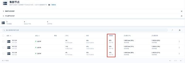 可以看到,集群当前有 3 台 Node 节点,且最大可运行Pod数量均为默认值:110。