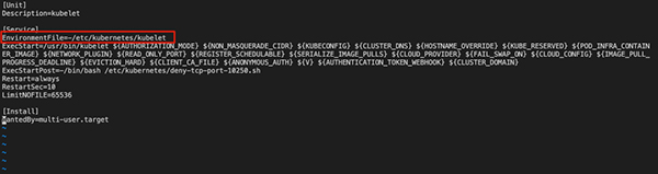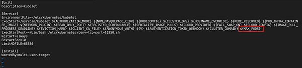 可以看到,Environment 文件是引用 /etc/kubernetes/kubelet,至此,我们只需要在 /etc/kubernetes/kubelet 中增加 max-pods 的变量,然后在 /usr/lib/systemd/system/kubelet.service 中,将变量添加到启动参数后即可。