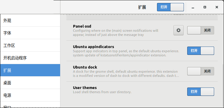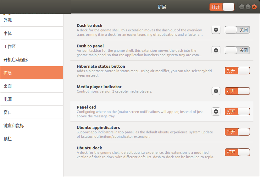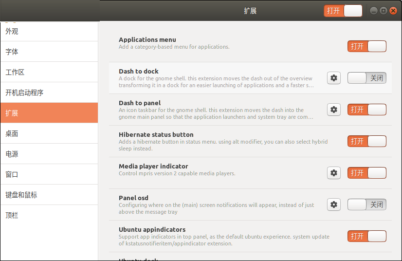 如果您想在Ubuntu系统中使用相同类型的菜单,可以通过Tweaks工具完成。移至Extensions面板,然后按如下所示打开Applications menu按钮: