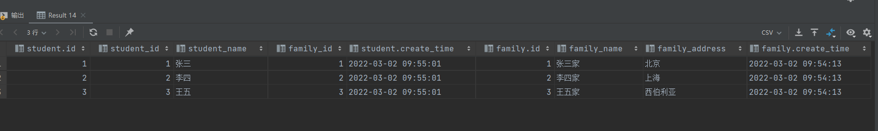 测试用学生表student和家庭表family数据如下: