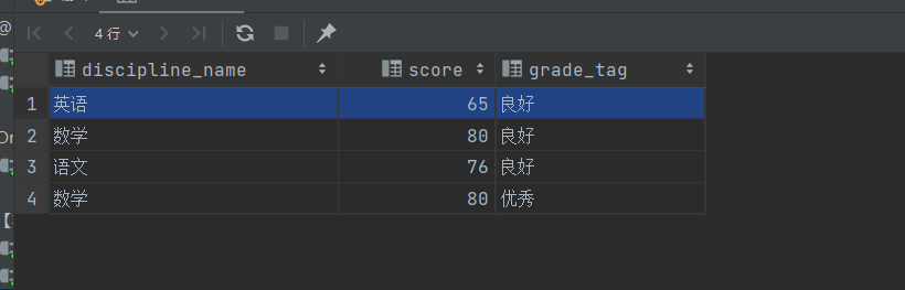 -- 先查询语文的分数 select score from achievement where discipline_name = '语文'; -- 再查询分数比语文分数更高的数据 select * from achievement where score > 76;