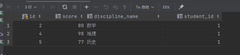 INSERT INTO achievement (id, score, discipline_name, student_id) VALUES (3, 65, '英语', 1);