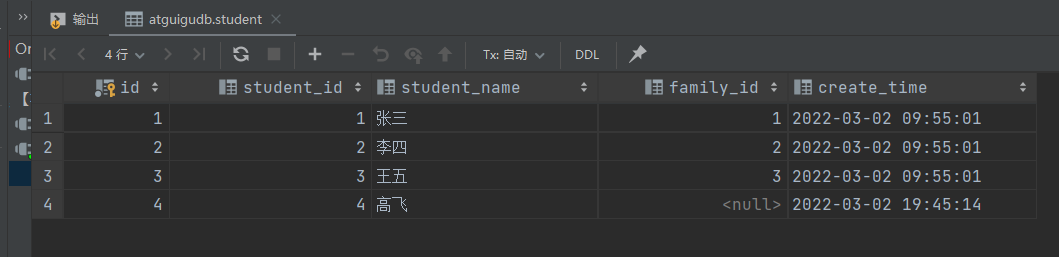 INSERT INTO student (id, student_id, student_name, family_id, create_time) VALUES (1, 1, '张三', 1, '2022-03-02 09:55:01');