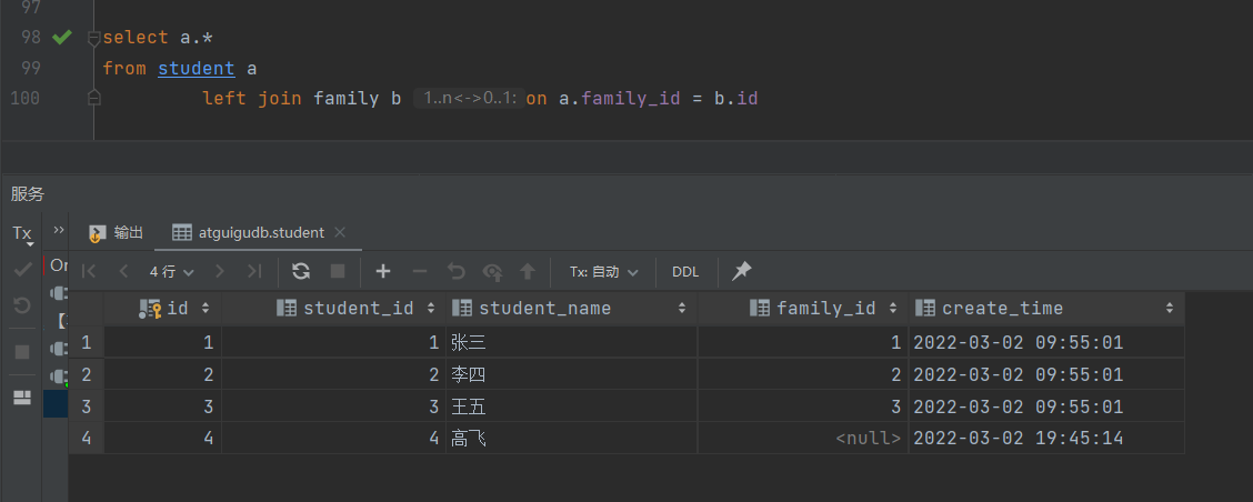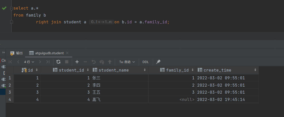 -- 查出student中的所有数据,不满足的显示为null -- 这里student在后面 select a.* from family b right join student a on b.id = a.family_id;