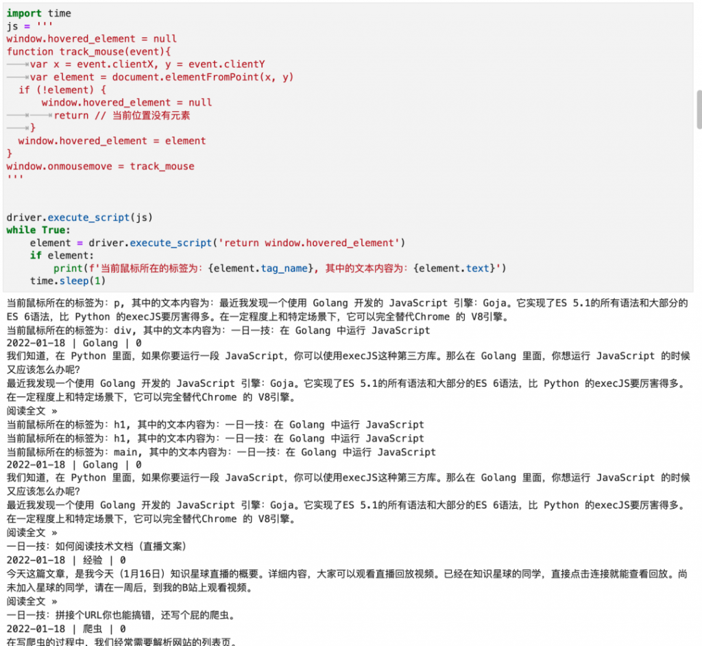 那么,如何把这个参数返回给Selenium呢?其实也非常简单,我们设置一个全局变量window.hovered_element,然后把当前鼠标对应的元素赋值给它。然后在Selenium中,使用.execute_script获取window.hovered_element就可以了。