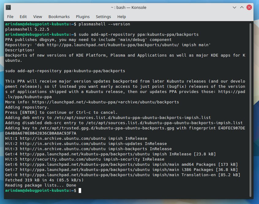 打开 Konsole,运行以下命令来添加 backports PPA。如果你喜欢,你可以验证你运行的 Plasma 是什么版本。
