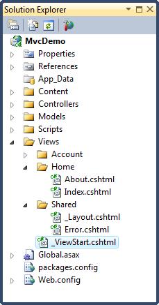 在 Views 文件夹中,Visual Web Developer 已经创建了一个 Account 文件夹、一个 Home 文件夹、一个 Shared 文件夹。