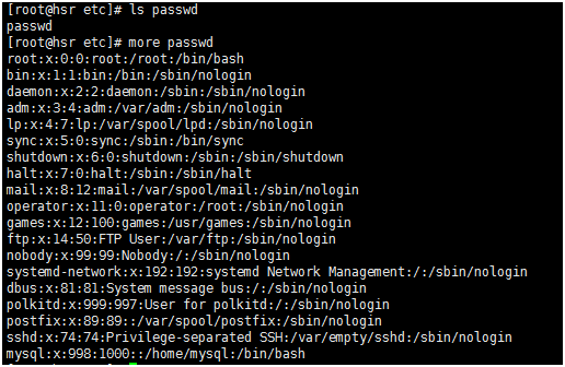 如上图:最后一个字段,告诉用户(root,mysql)使用的是shell程序,是使用bin/bash作为自己的默认shell程序,这意味着当root登录Linux系统后,bash shell会自动启动。后面也会讲到dash和tcsh之类的shell。