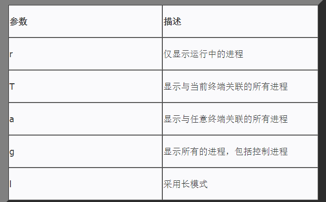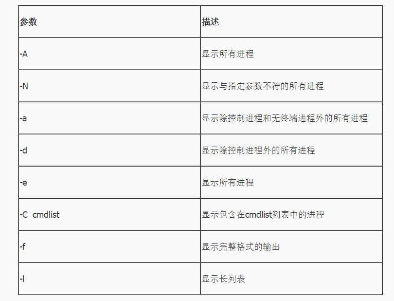 在ps中每种风格的参数都很多,下面例举一些常用的Unix风格的ps命令参数。下面表格还有很多参数没有列出来。