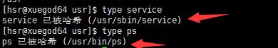 当命令是外部命令时,type还会显示外部命令所在路径,如下图,查看service和ps的路径: