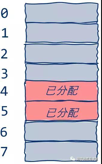 假定我们系统中宝贵的内存大小只有8字节,其中有两个字节已经分配出去了,就像这样: