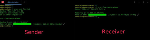 使用 croc 工具传输数据的速度很快,因为它充当系统之间的中继服务器。它在两台计算机之间创建了全双工实时通信层,因此「上传」和「下载」任务在两台计算机之间同时发生。