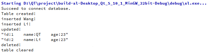 #include "mainwindow.h" #include//添加头文件 #include #include #include #include int main(int argc, char *argv[]) { QApplication a(argc, argv); //建立并打开数据库 QSqlDatabase database; database = QSqlDatabase::addDatabase("QSQLITE"); database.setDatabaseName("MyDataBase.db"); if (!database.open()) { qDebug() < "error:="" failed="" to="" connect="" database."="">< database.lasterror();="" }="" else="" {="" qdebug()="">< "succeed="" to="" connect="" database."="" ;="" }="" 创建表格="" qsqlquery="" sql_query;="" if(!sql_query.exec("create="" table="" student(id="" int="" primary="" key,="" name="" text,="" age="" int)"))="" {="" qdebug()="">< "error:="" fail="" to="" create="">< sql_query.lasterror();="" }="" else="" {="" qdebug()="">< "table="" created!";="" }="" 插入数据="" if(!sql_query.exec("insert="" into="" student="" values(1,="" "wang",="" 23)"))="" {="" qdebug()="">< sql_query.lasterror();="" }="" else="" {="" qdebug()="">< "inserted="" wang!";="" }="" if(!sql_query.exec("insert="" into="" student="" values(2,="" "li",="" 23)"))="" {="" qdebug()="">< sql_query.lasterror();="" }="" else="" {="" qdebug()="">< "inserted="" li!";="" }="" 修改数据="" sql_query.exec("update="" student="" set="" name="QT" where="" id="1" );"="" if(!sql_query.exec())="" {="" qdebug()="">< sql_query.lasterror();="" }="" else="" {="" qdebug()="">< "updated!";="" }="" 查询数据="" sql_query.exec("select="" *="" from="" student");="" if(!sql_query.exec())="" {=""> <"deleted!"; }="" 删除表格="" sql_query.exec("drop="" table="" student");="" if(sql_query.exec())="" {="" qdebug()="">"deleted!";>< sql_query.lasterror();="" }="" else="" {="" qdebug()="">< "table="" cleared";="" }="" 关闭数据库="" database.close();="" return="" a.exec();="" }="">