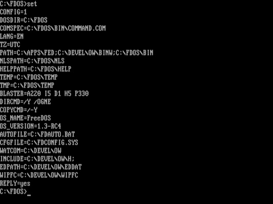 在 FreeDOS 上,环境变量提供一种类似的功能。一些变量控制 DOS 系统的行为,另一些变量用于存储一些临时值。