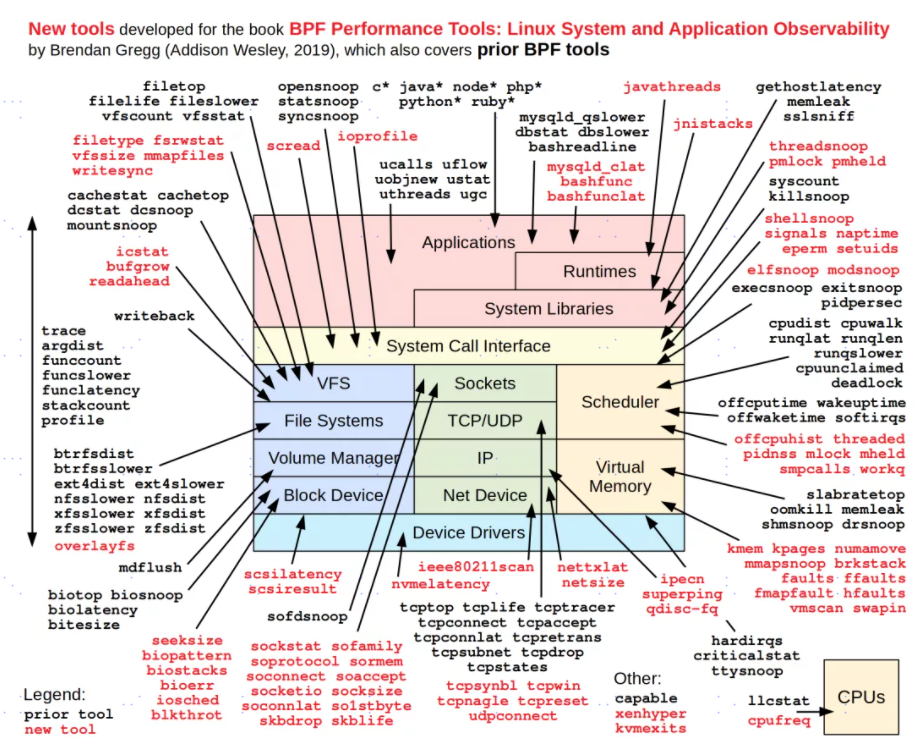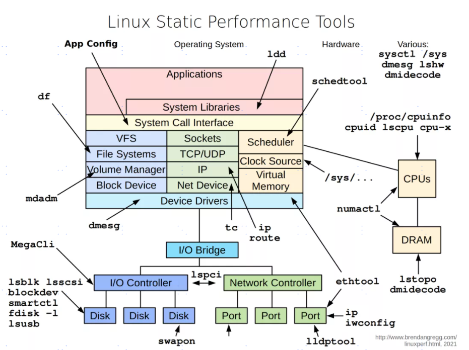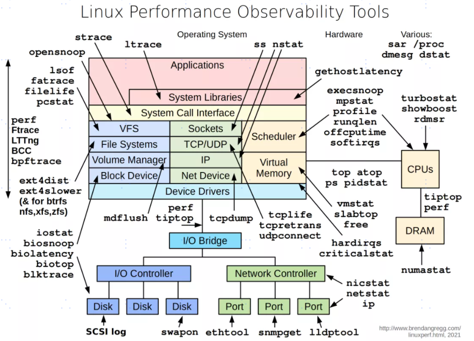 这里包含Linux 性能资料的工具图。它们展示了:Linux 可观察性工具、 Linux 静态性能分析工具、 Linux 基准测试工具、 Linux 调优工具和Linux sar。
