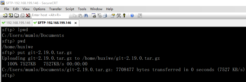 注意:上传的文件会在登录用户的home目录下,可以通过lpwd查看本地目录,pwd查看远端目录