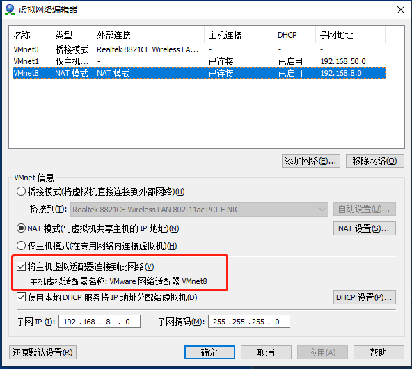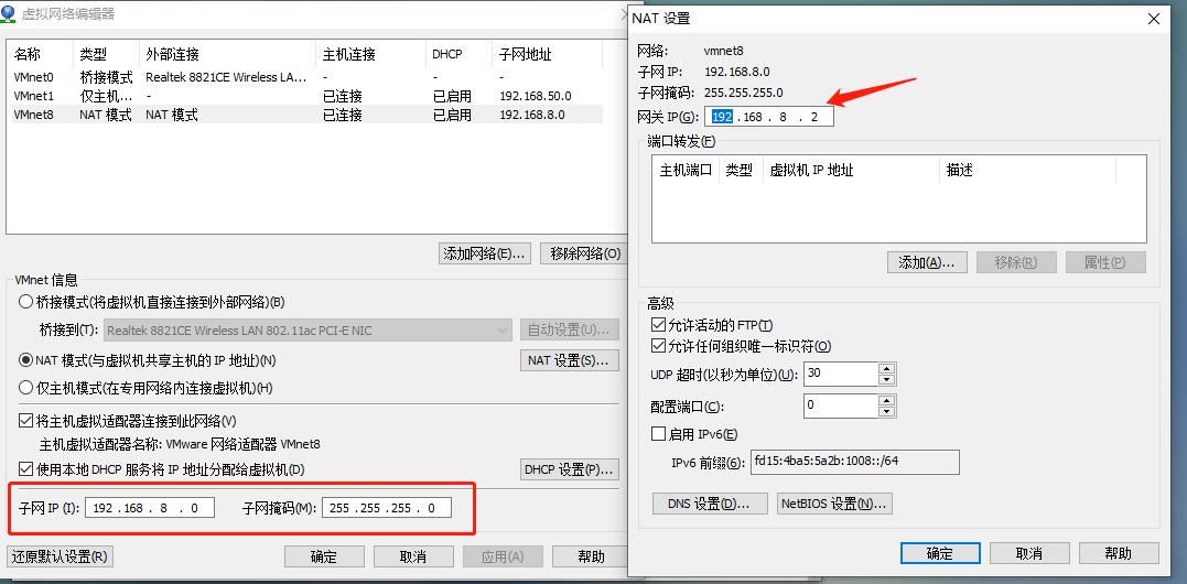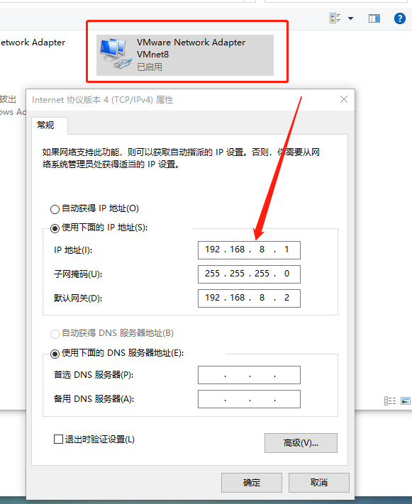 在物理机上,设置VMnet8网卡为静态ip地址,子网的网段与虚拟机的一样为 192.168.8.1,网关为192.168.8.2【根据虚拟机的子网IP设置】,设置好后再禁用,启动即可重启网卡。