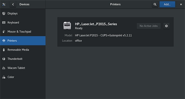 一旦你安装了需要的驱动程序包,你就能手工添加你的打印机了。首先,把打印机连接到运行的电脑上,并打开打印机电源。然后从“活动”屏幕或者应用列表中找到并打开“打印机”设置。