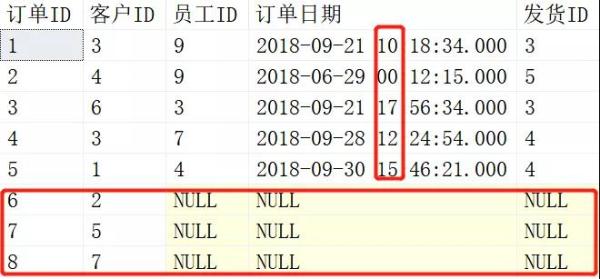 我们发现与Customers表里匹配上的订单日期被修改了,订单日期往后推迟了一小时,而没有匹配上的在订单表尾部增加了几行记录。这就是MERGE的实际应用了。