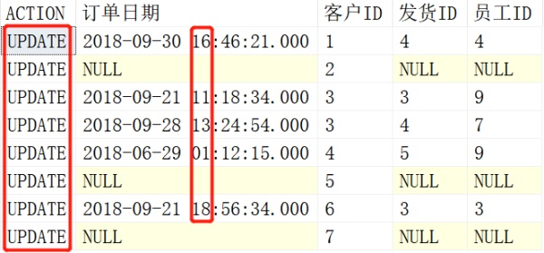 从上图我们看到,执行的动作都是更新,这里的动作只有UPDATE和DELETE,插入也属于更新,此外我们看到订单日期又往后推迟了一小时,是因为我们又一次执行了往后增加一小时的更新操作,其他的字段没变。