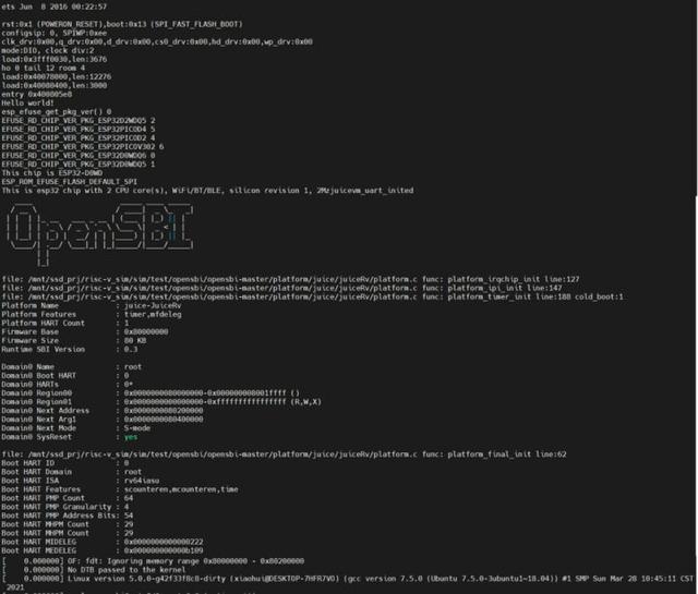 上面缩短的引导日志显示 ESP32-D0WD 双核 Xtensa 处理器最终是可以引导 Linux 5.0.0 加载程序输出的。但是引导的过程有点复杂,因为引导加载程序需要先跳转到被描述为“小型 RISC-V 虚拟机”的“Juice Vm”上,然后调用OpenSBI RISC-V 开源管理器二进制接口来加载 Linux 内核和小型文件系统。