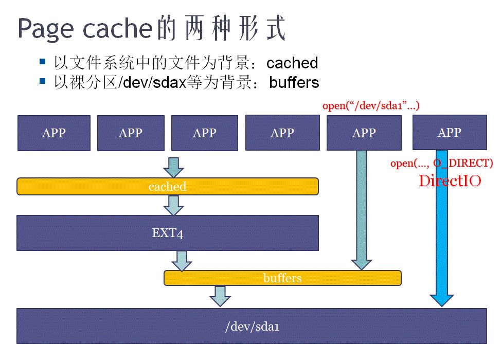 buffer 和 cache 是两个在计算机技术中被用滥的名词,放在不通语境下会有不同的意义。在 Linux 的内存管理中,这里的 buffer 指 Linux 内存的: Buffer cache 。这里的 cache 指 Linux 内存中的: Page cache 。翻译成中文可以叫做缓冲区缓存和页面缓存。在历史上,它们一个( buffer )被用来当成对 io 设备写的缓存,而另一个( cache )被用来当作对 io 设备的读缓存,这里的 io 设备,主要指的是块设备文件和文件系统上的普通文件。但是现在,它们的意义已经不一样了。在当前的内核中, page cache 顾名思义就是针对内存页的缓存,说白了就是,如果有内存是以 page 进行分配管理的,都可以使用 page cache 作为其缓存来管理使用。当然,不是所有的内存都是以页( page )进行管理的,也有很多是针对块( block )进行管理的,这部分内存使用如果要用到 cache 功能,则都集中到 buffer cache 中来使用。(从这个角度出发,是不是 buffer cache 改名叫做 block cache 更好?)然而,也不是所有块( block )都有固定长度,系统上块的长度主要是根据所使用的块设备决定的,而页长度在 X86 上无论是 32 位还是 64 位都是 4k 。