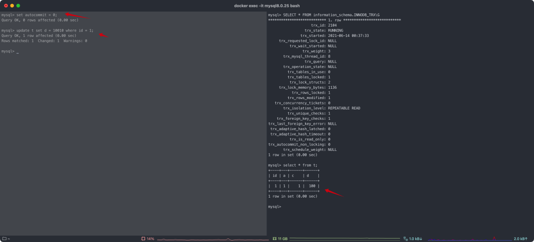 通过截图可以看出,有一个事务在执行,因为设置了 set autocommit = 0;,所以后面的 update 操作修改结果,其他 session 并不会查到(RR 级别)。