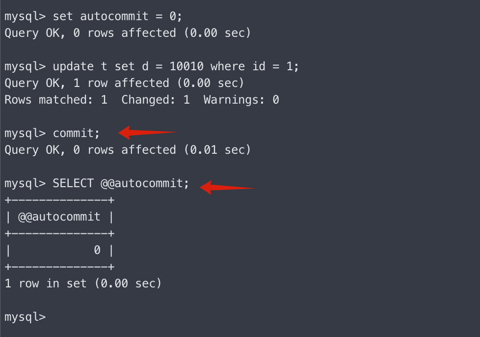 默认情况下 autocommit = 1,是自动提交事务的。autommit 是 session 级别的,就是当前连接更改了 autocommit,对其他连接没有影响。设置 autocommit 之后,本次连接的所有 sql 都是事务的形式,比如每次 commit 提交。