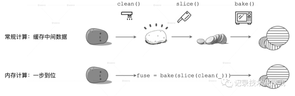 但在下面的内存计算中,所有操作步骤如 clean、slice、bake,都会被捏合在一起构成一个函数。这个函数一次性地作用在“带泥土豆”上,直接生成“即食薯片”,在内存中不产生任何中间数据形态。