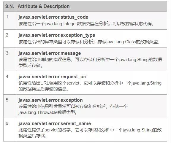 另外当一个 Servlet 抛出一个异常时,处理异常的Servlet可以从HttpServletRequest里面得到几个属性,如下:
