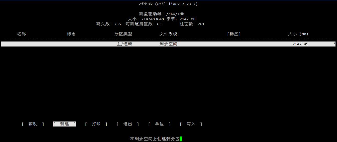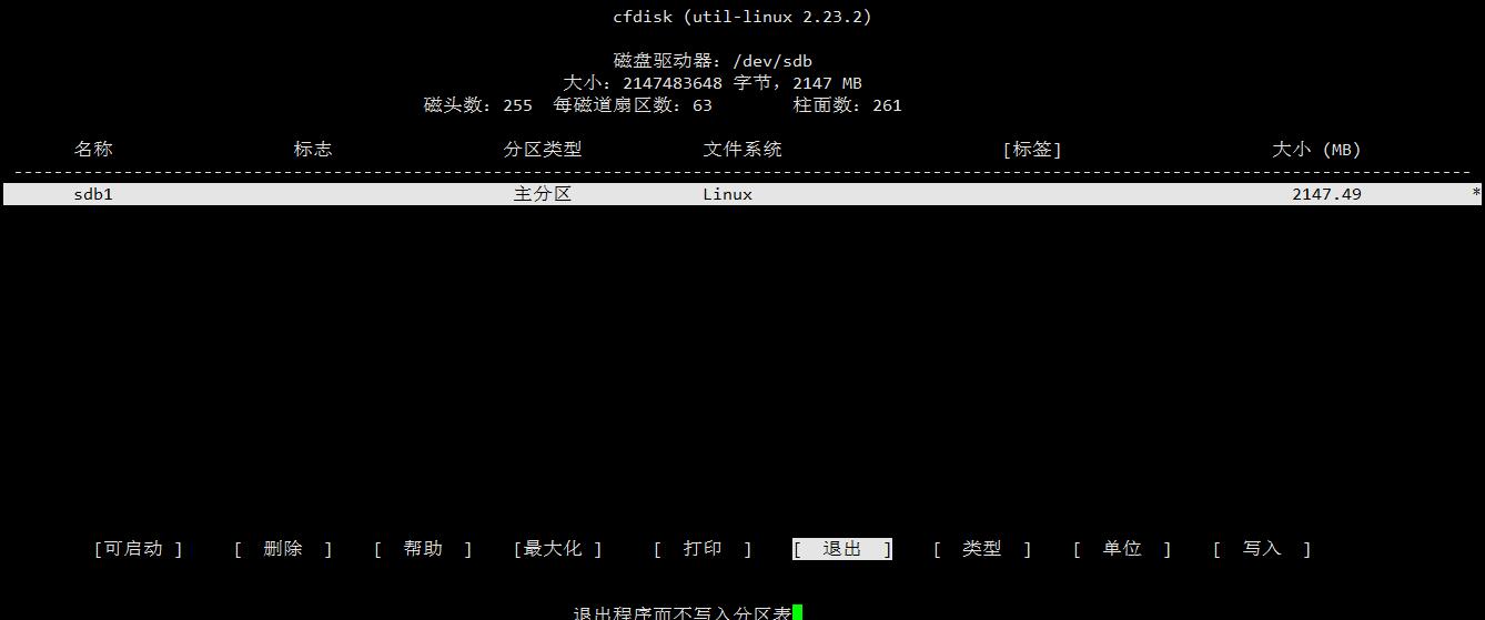 2 . 使用cfdisk来对设备sdb来进行分区操作。