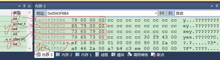 实验方式很简单,分别查看 "yes"/'yes'/'ye'/'y' 四种字符在内存中的存储形式,代码如下: