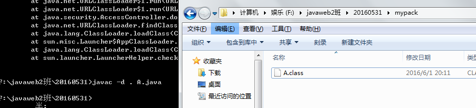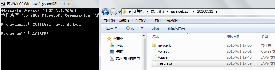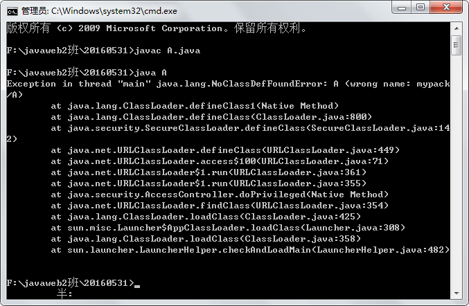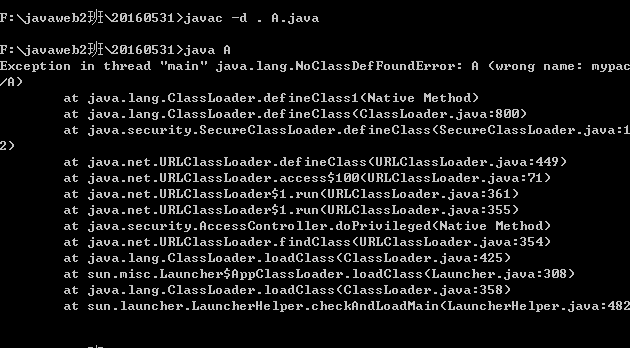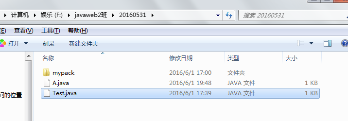 如下:F:\javaweb2班\20160531目录下有A.java 文件,注意源文件中有包声明: