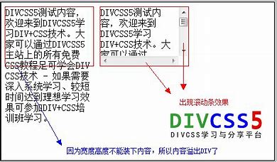 以上实例表示如果 div 内容的高度大于 300px 就会出现垂直滚动条,小于 300px 就没有滚动条。如果宽度大于 70px 会出现水平滚动条,小于就没有。