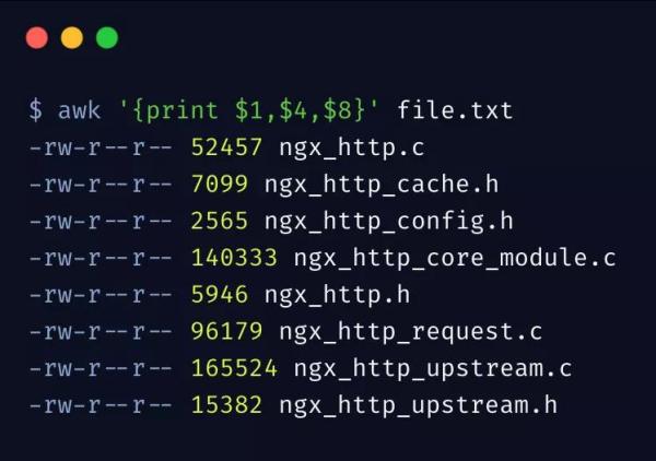 好了,我们先来一个最简单最常用的 awk 示例,输出第 1、4、8 列: