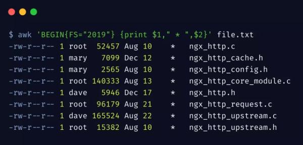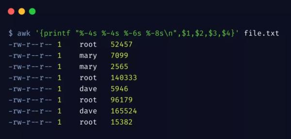 再来看下 awk 比较实用的功能 格式化输出。和 C 语言的 printf 格式输出是一毛一样,我个人特别喜欢这种格式化方式,而不是 C++ 中的流的方式。