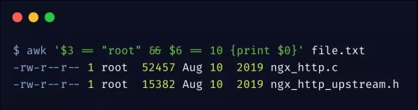 上边的过滤条件为,第 3 列为 root 且第 6 列为 10 的行,才会被输出。