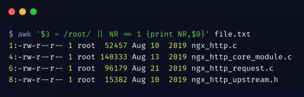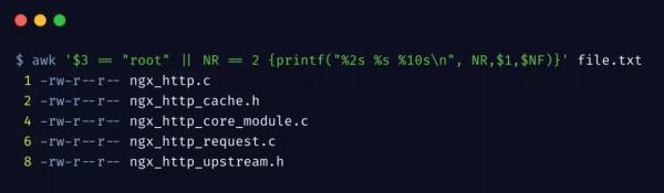 过滤第 3 列为 root 用户,以及第 2 行内容,且打印时输出行号。NR 表示当前第几行,NF表示当前行有几列。